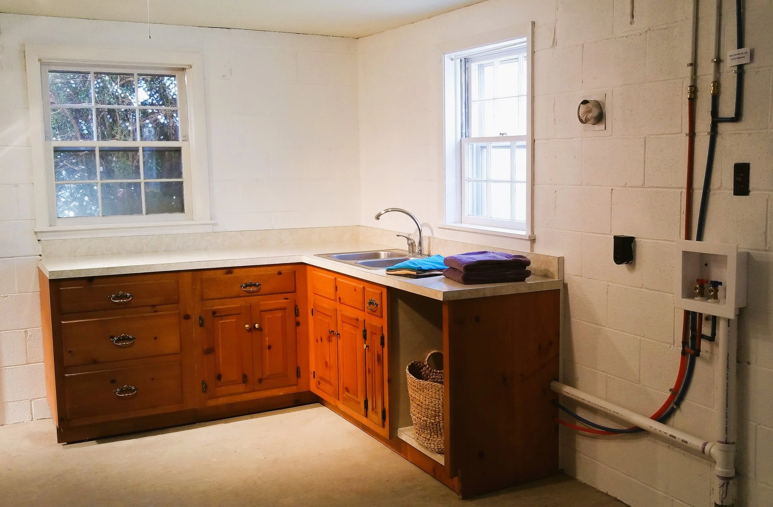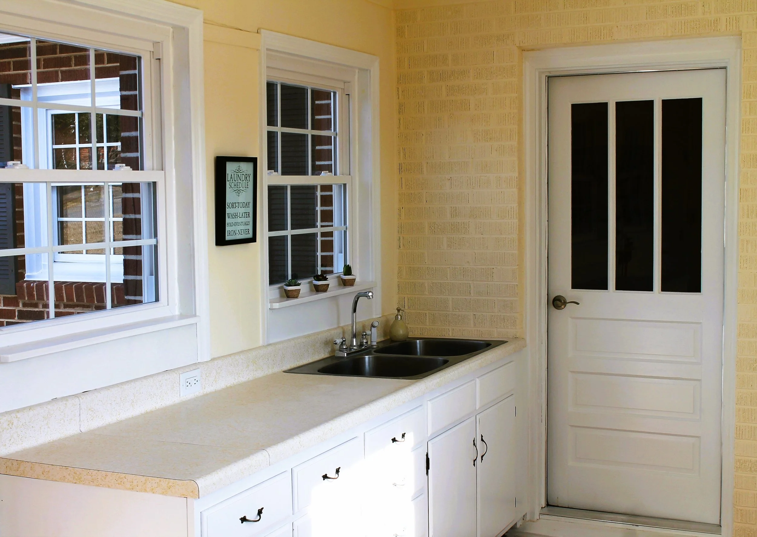 Existing kitchen cabinets were removed and repurposed into these new laundry areas